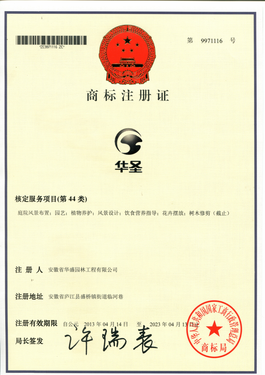 牌商标设计的基本含义是:(1)中徽园林公司的前身为安徽华盛园林工程公司,注册地为庐江县盛桥镇。苗木养护和景观设计均为公司的主导产业。(2)安徽黄山是世界三遗产地(即自然、文化遗产和世界地质公园),迎客松是安徽代表性标识;将华盛园林“盛”字的拼音首字母“S”抽象成迎客松形象,旨在突出企业的名称、地域性和发展使命。(3)圆形象征着地球,加上“华圣”两个汉字构成商标,隐喻公司立足安徽走向世界的美好愿景,象征着企业立足于安徽,面向全国,弘扬爱国、进取、竞争、和谐、勤俭的徽商精神和热情、拼搏、顽强、坚韧、博大的迎客松精神,争创国内一流企业,实现为生态大地扮绿、为美丽中国添彩的执着追求。