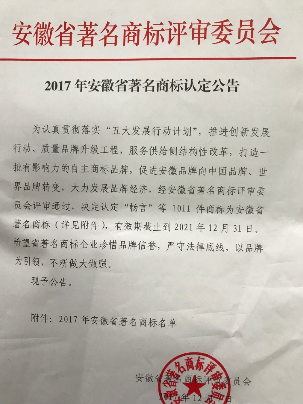 2017年12月17 日,安徽省著名商标评审委员会公告:我公司申报的