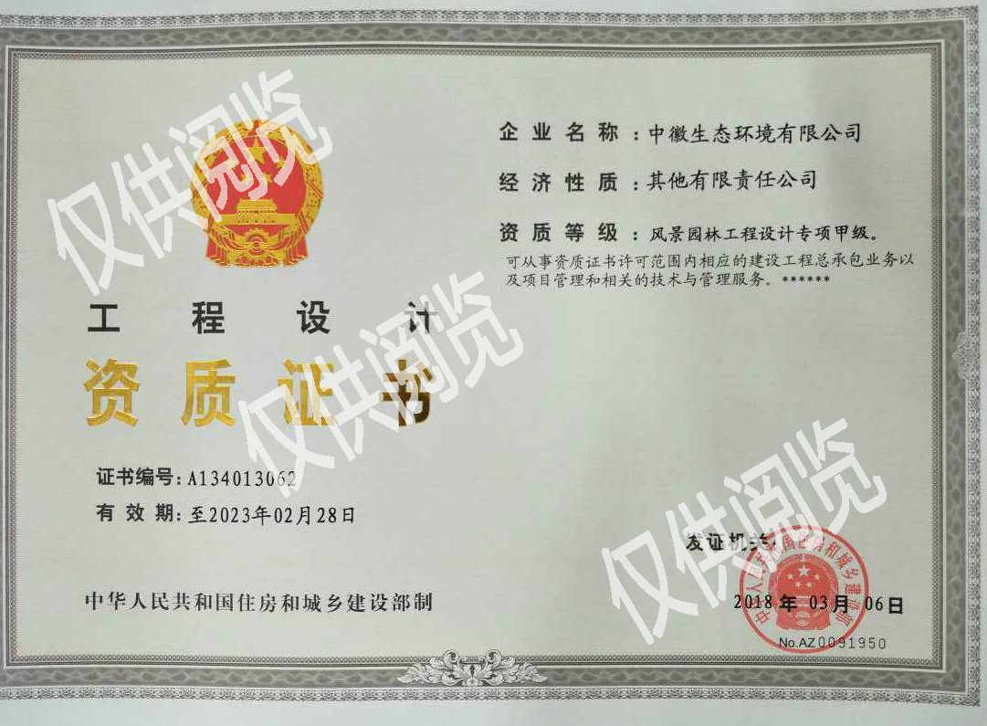 中徽生态环境有限公司于2018年3月6日获得中华人民共和国住房和城乡建设部下发的“工程设计” 资质证书。