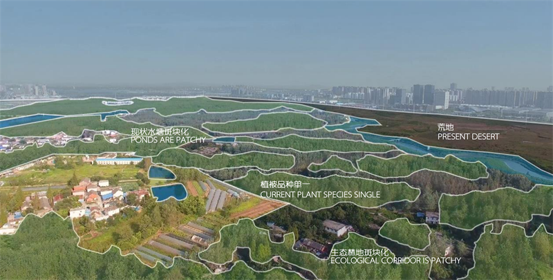 现状生态斑块化严重,水系不联通,通过构建连续的绿色生态基底,串联水系,形成蓝绿交织的生态系统。