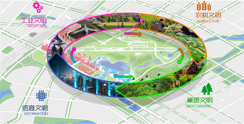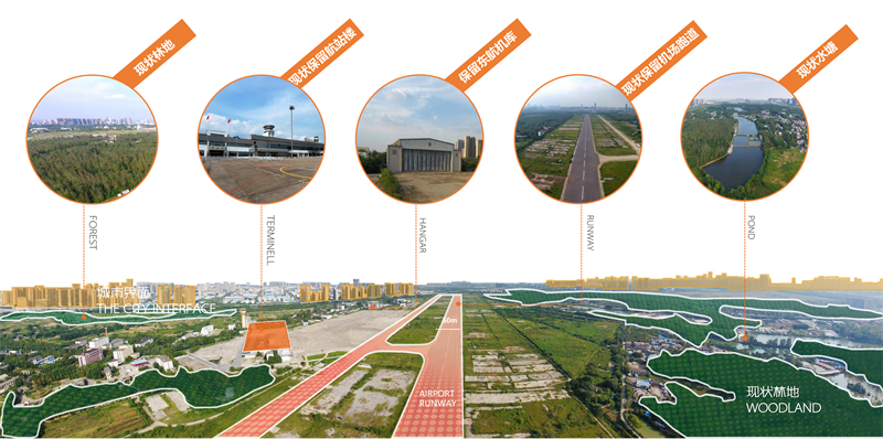 场地遍布圩田、河流、森林等自然遗产,遗留航站楼、东航机库、机场跑道、全向信标塔等工业遗产,留存传承场地文脉和遗产元素,焕发场地最大的文化价值和精神价值。巢居文明、农耕文明、工业文明到信息文明的转换,延续场地文脉,留住城市记忆。