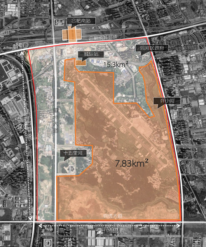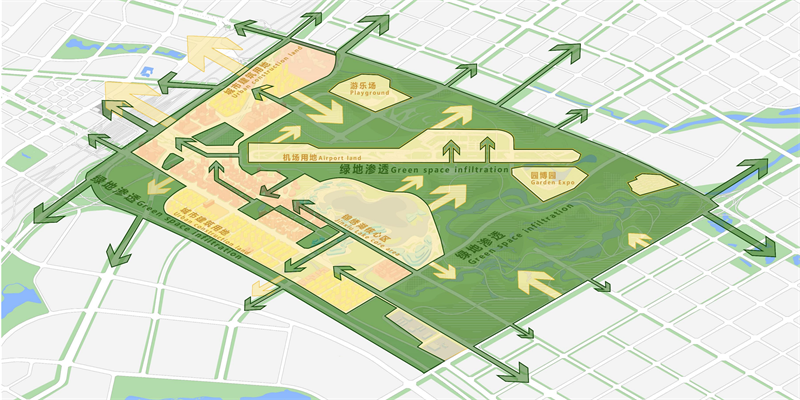 骆岗机场跑道的保留传承了场地记忆,但同时存在着超大体量铺装的影响,整体轴线方向不符合城市发展方向,生态受到割裂。