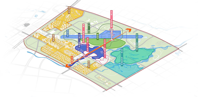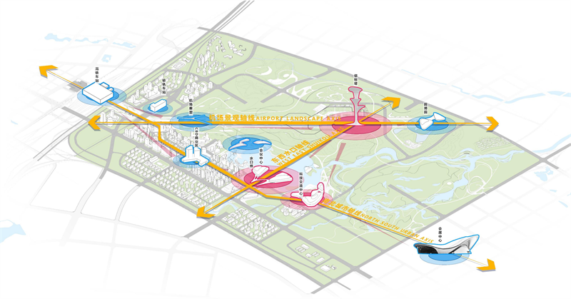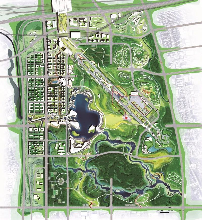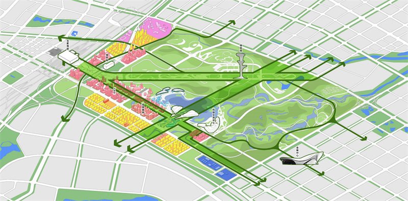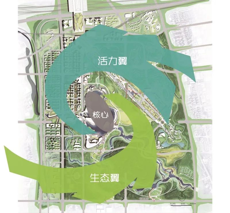 将设计重点从废弃跑道的改造与利用,转向以锦绣湖为中心的核心景区打造,该核心可以带动新城中央公园的向心性发展,降低跑道对城市整体规划的过度影响,整体规划形成一核两翼的格局,活化滨湖新城。
