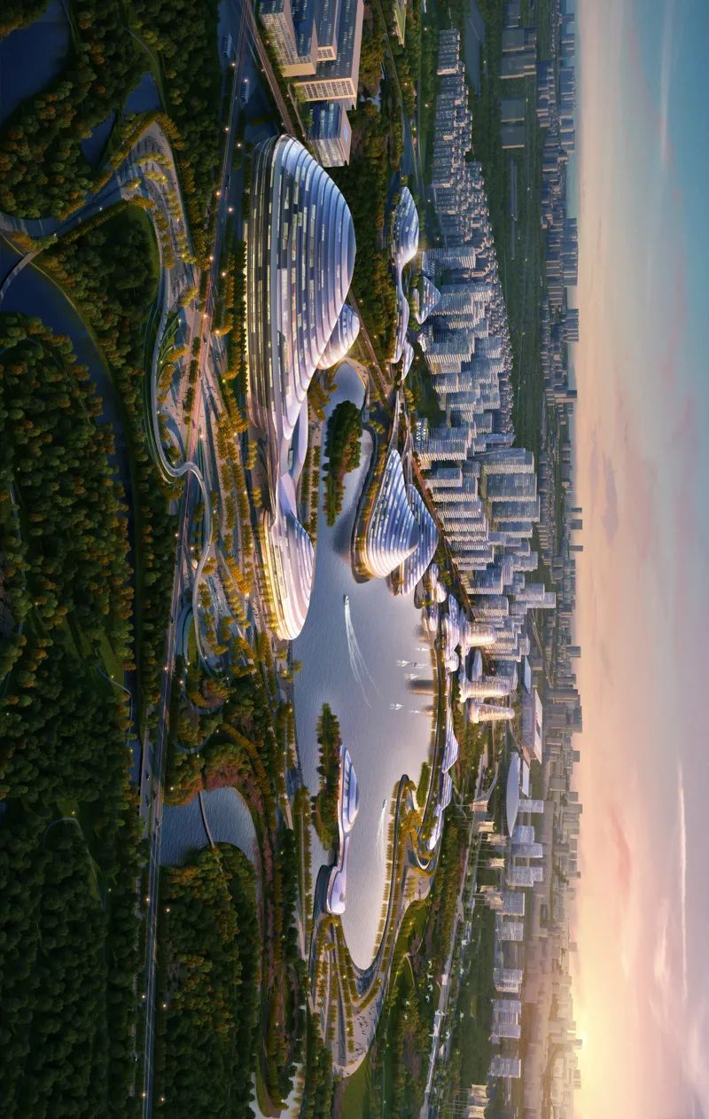 设计秉承一核,两翼,九区,多根系的规划结构,依托锦绣湖和国际科学交流中心形成的综合服务核,犹如树木的根颈,生发出超级根系穿透城市服务区和机场,桥接合肥南站和城际站,牵手不同功能和主题的九大分区及周边城市组团,城园相融,打造生命共同体。