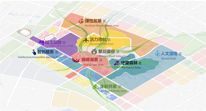 以锦绣湖公园为核心依托,结合生态翼、活力翼打造核心景观区。结合周边城市组团,设置配套服务,满足周边居民及人群的使用需求。