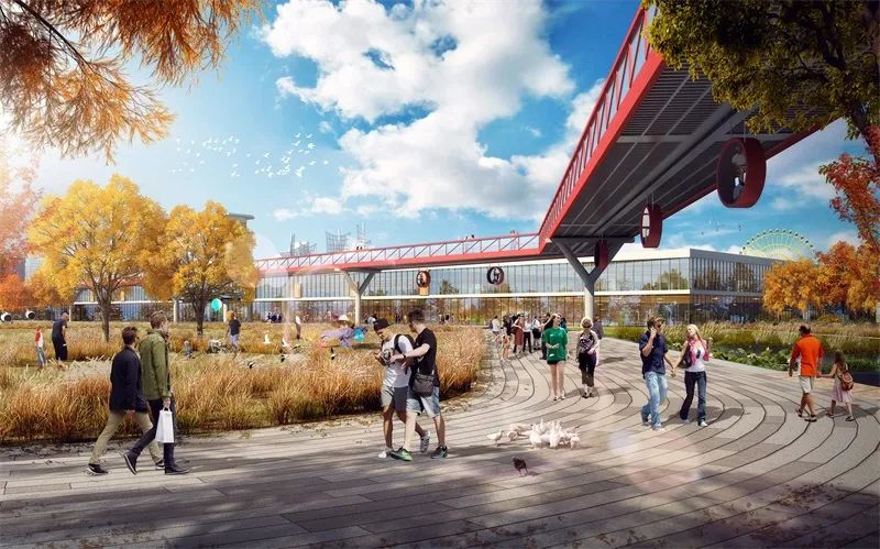突破城市与公园割裂形态,将建筑引入场地,消纳部分城市功能,城市融入公园,公园渗入城市。