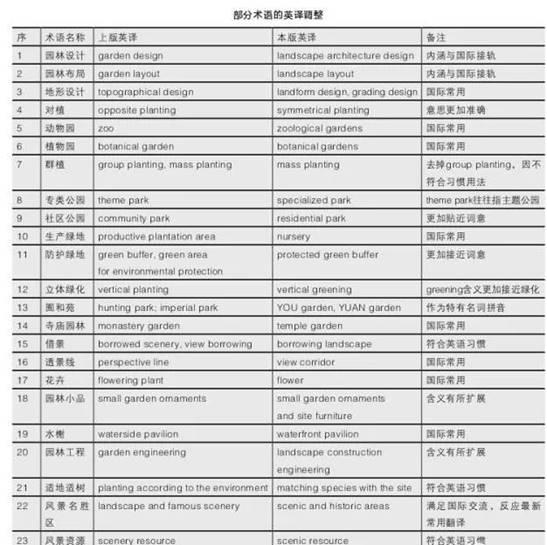 园林专业术语知多少医疗团队有行话,金融有行话,码农们窃窃私语的时候也说着我们听不懂的语言,哪怕是黑道或者电视里的盗墓者都有属于本行的行话。 用行话沟通,不仅仅是增强对本行业的归属感,也可以快速有效地表明意图,让对方心领神会,避免会错意。 让我们今天就来学习一下园林的专业术语吧,可别再在工作中会错意了呀。 根据建设部发布的《园林基本术语标准》,列出几项常用术语。 城市绿地系统规划 ![]() 1 城市绿地系统 urban green space system 由城市中各种类型和规模的绿化用地组成的整体。 2 城市绿地系统规划 urban green space system planning 对各种城市绿地进行定性、定位、定量的统筹安排,形成具有合理结构的绿色空间系统,以实现绿地所具有的生态保护、游憩休闲和社会文化等功能的活动。 3 绿化覆盖面积 green coverage 城市中所有植物的垂直投影面积。 4 绿化覆盖率 percentage of greenery coverage 一定城市用地范围内,植物的垂直投影面积占该用地总面积的百分比。 5 绿地率 greening rate,ratio of green space 一定城市用地范围内,各类绿化用地总面积占该城市用地面积的百分比。 6 绿带 green belt 在城市组团之间、城市周围或相邻城市之间设置的用以控制城市扩展的绿色开敞空间。 7 楔形绿地 green wedge 从城市外围嵌入城市内部的绿地,因反映在城市总平面图上呈楔形而得名。 8 城市绿线 boundary line of urban green space 在城市规划建设中确定的各种城市绿地的边界线。 园林史 ![]() 9 园林史 landscape history,garden history 园林及其相关因素发生、发展和演变的历史。 10 古典园林 classical garden 对古代园林和具有典型古代园林风格的园林作品的统称。 11 囿 hunting park 中国古代供帝王贵族进行狩猎、游乐的一种园林类型。 12 苑 imperial park 在囿的基础上发展起来的,建有宫室和别墅,供帝王居住、游乐、宴饮的一种园林类型。 园林艺术 ![]() 13 园林艺术 garden art 在园林创作中,通过审美创造活动再现自然和表达情感的一种艺术形式。 14 相地 site investigation 泛指对园址场地条件的勘察、体察、分析和利用。 15 造景 landscapin 使环境从没有观赏价值到具有观赏价值,或从较低的观赏价值到较高的观赏价值的活动。 16 借景 “借”有借用、因借、依据和凭借的意思。借景可分为:近借、远借、邻借、互借、仰借、俯借和应时借等。 17 园林意境 园林意境对内可以抒己,对外足以感人。园林意境强调的是园林空间环境的精神属性,是相对于园林生态环境的物质属性而言的。 园林造景并不能直接创造意境,但能运用人们的心理活动规律和所具有的社会文化积淀,充分发挥园林造景的特点,创造出促使游赏者产生多种优美意境的环境条件。 18 透景线 透景线与透视线有所不同。透景线远方空间的终点是可以被观赏的具体景物,而透视线仅仅是远方的可透视空间。 19 盆景 盆景大多用植物、水、石等材料,经过艺术加工,种植或布置在盆中,使之成为自然景物缩影的一种陈设品。日本的盆栽又称盆栽植物(bonsai),与我国的植物盆景相似。 规划设计 ![]() 20 园林规划 园林规划包括风景名胜区规划、城市绿地系统规划和公园规划。面积较大和复杂区域的规划,按照工作阶段一般可以分为规划大纲、总体规划和详细规划。 园林规划的重点为:分析建设条件,研究存在问题,确定园林主要职能和建设规模,控制开发的方式和强度,确定用地和用地之间、用地与项目之间、项目与经济的可行性之间合理的时间和空间关系。 21 园林布局 园林布局是园林规划、设计的一部分,主要是对于园林各个要素进行空间安排,将园林中的空间资源进行合理配置。包括园林山水骨架的形成,不同功能用地的划分、园林主景的位置、出人口、园林建筑、园路和基础设施布置等。园林布局很大程度上决定着园林的艺术风格。根据园林布局手法的不同,分为规则式园林、自然式园林和抽象式园林三种形式。 22 园林设计 指对组成园林整体的山形、水系、植物、建筑、基础设施等要素进行的综合设计,而不是指针对园林组成要素进行的专项设计。 园林设计包括总体设计(方案设计)和施工图设计两个阶段。方案设计指对园林整体的立意构思、风格造型和建设投资估算;施工图设计则要提供满足施工要求的设计图纸、说明书、材料标准和施工概(预)算。 规划与设计的关系。从工作程序上看,一般是规划控制设计,设计指导施工,即总体规划、详细规划、总体设计(方案设计)、施工图设计。从工作深度上看,一般图纸的比例小于1/500为园林规划,比例大于1/500为园林设计。规划偏重宏观的综合部署和理性分析;园林设计偏重感性的艺术思维,主要通过造型来满足园林的功能和审美要求。规划所涉及的空间一般比较大,时间比较长;设计所涉及的空间一般比较小,时间就是建设的当时。规划是基础,设计是表现。规划和设计在中间层次有可能产生一定的工作交叉。 23 公园最大游人量 公园最大游人容量是计算公园各种设施数量、规模以及进行公园管理的依据。 24 地形设计 地形设计往往和竖向设计相结合,包括确定高程、坡度、朝向、排水方式等。同时,地形设计还应当考虑工程上的安全要求、环境小气候的形成以及游人的审美要求等。 25 种植设计 种植设计是园林设计的重要部分。植物配置除讲求构图、形式等艺术要